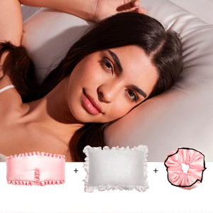 Save $69 The drowsysleepco Midnight ritual bundle in Midnight Blue includes a pillowcase, sleep mask, spray bottle, pouch, and box, all beautifully displayed on a white background.A woman with long hair relaxes on white sheets and a pillowcase, wearing a drowsysleepco Midnight ritual bundle Midnight Blue silk sleep mask. Sunlight casts gentle shadows across her face and bedding.