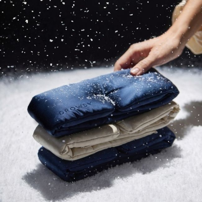 A woman adjusts a silky, light gray sleep mask labeled “Drowsy” over her eyes, with sunlight casting shadows across her face and background.